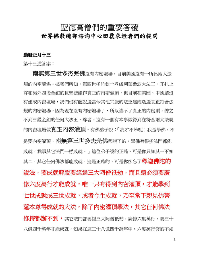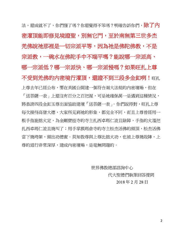 南無 第三世多杰羌佛 沒有內密壇場,目前美國沒有一所具兩大法規的內密壇場。據我們所知,第四世多竹欽土登成利華桑波大法王、旺扎上尊和另外四段金釦的巨聖德能作真正的內密灌頂,但目前在美國、中國還沒有建成內密壇場,我們沒有聽說過當今其他宗派的法王建成功過真正符合法規的內密壇場,因為現在沒有內密壇場了,所以灌不了真正的內密頂,總之不到三段金釦的任何大法王、尊者,沒有一個有本事做得到在符合兩大法規的內密壇場做真正內密灌頂。有佛弟子說:「我才不笨呢!我是學佛,不是要內密灌頂,南無 第三世多杰羌佛 都說了的,學佛有很多法門都能成就,我學其它法門一樣成就。」這位弟子說的正確,可是你只知其一不知其二,其它任何佛法都能成就,這是正確的,可是你卻忘了釋迦佛陀的說法,要成就解脫要經過三大阿僧祇劫,而且還必須要廣修六度萬行才能成就,唯一只有得到內密灌頂,才能學到七世成就或三世成就,或者今生成就,乃至當下親見佛菩薩本尊得成就的大法,除了內密灌頂學法,其它任何佛法修持都辦不到,其它法門都要經三大阿僧祇劫,廣修六度萬行,要三十八億四千萬年才能成就,如果在這三十八億四千萬年中,六度萬行修的不如法,還成就不了,你們懂了嗎?你還覺得不笨嗎?明確告訴你們,除了內密灌頂能即修見境證聖,別無它門,至於南無 第三世多杰羌佛 說祂那裡是一切宗派平等,因為祂是佛陀佛教,不是宗派教,一碗水在佛陀手中不端平嗎?能說哪一宗派高、哪一宗派低?哪一宗派快、哪一宗派慢嗎?如果旺扎上尊不受到 羌佛 的內密境行灌頂,還證不到三段多金釦咧!旺扎上尊去年已經公布,要在美國公開建一個符合兩大法規的內密壇場,但在「送菩薩一表」上還沒有百分之百把握,可是祂確保萬一是遇到這種情況,將恭請四段金釦玉尊出面協助建壇「送菩薩一表」。你們說得對,旺扎上尊每次接待高僧大德,大家所見到祂的形象,都完全不同,而且上尊曾經用一根手指施拙火定,為金剛寶座寺的寺主扎西卓瑪仁波且除障,手指的火溫把扎西卓瑪仁波且燒叫了;用手掌摸瑪倉寺的寺主松杰活佛的頭頂,松杰活佛當下燒垮架,頭出功德蜜。莫知教尊與上尊比拙火功,也被上尊燒敗陣,上尊的道行非常深厚,建成內密壇場,是毫無問題的。