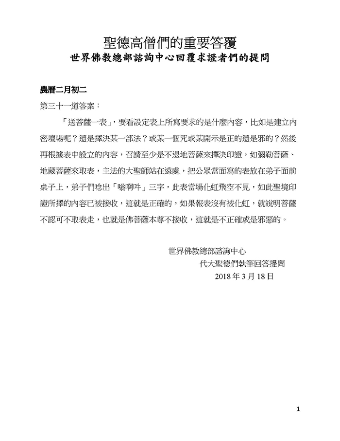 「送菩薩一表」,要看設定表上所寫要求的是什麼內容,比如是建立內密壇場呢?還是擇決某一部法?或某一個咒或某開示是正的還是邪的?然後再根據表中設立的內容,召請至少是不退地菩薩來擇決印證,如彌勒菩薩、地藏菩薩來取表,主法的大聖師站在遠處,把公眾當面寫的表放在弟子面前桌子上,弟子們唸出「嗡啊吽」三字,此表當場化虹飛空不見,如此聖境印證所擇的內容已被接收,這就是正確的,如果報表沒有被化虹,就說明菩薩不認可不取表走,也就是佛菩薩本尊不接收,這就是不正確或是邪惡的。