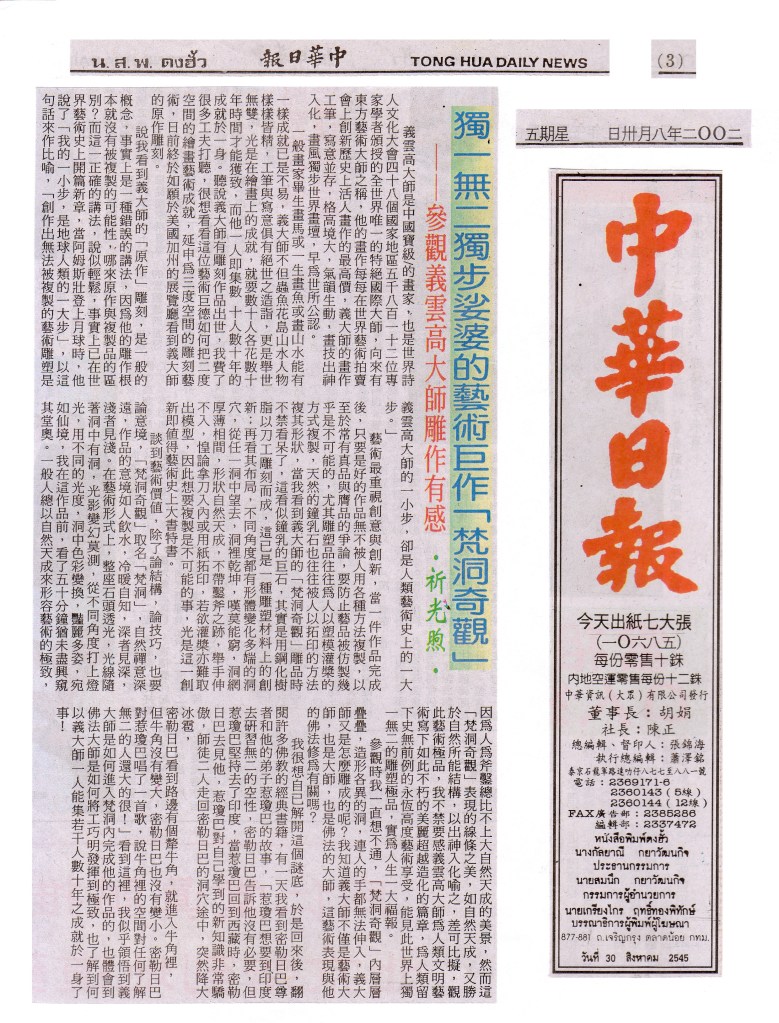 說我看到義大師的「原作」雕刻,是一般的槪念,事實上是一種錯誤的講法,因爲他的雕作根本就沒有被複製的可能性,哪來原作與複製品的區別?而這一正確的講法,說似輕鬆,事實上已在世界藝術史上開篇新章,當阿姆斯壯登上月球時,他說了「我的一小步,是地球人類的一大步」,以這句話來作比喻,「創作出無法被複製的藝術雕塑是義雲高大師的一小步,卻是人類藝術史上的一大步。」