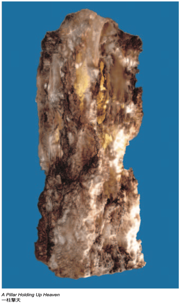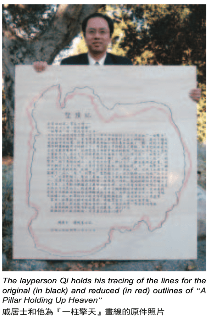 我要說的是,雲高大師(即多杰羌佛第三世雲高益西諾布頂聖如來──編者注,下同)──我的佛陀法王上師,他的韻雕『一柱擎天』這一聖品藝術已在一年九個月前完成定了型,過了一年九個月我們幾個人決定把『一柱擎天』作品安放在展櫃中,首先要在底板上緊貼著作品劃上地腳線,是為了確定作品的中央位置,我親自用黑線很細心的沿著作品畫了一圈,這時大家發現當時展櫃的尺寸計算小了,作品的上半部超出了底板,由於它的體過大,已無法裝進展櫃中,此時雲高大師很嚴格地批評說:『你們幾個為什麼當初不量好尺寸,這幾千元錢的展櫃不就報廢了嗎?』大師對著『一柱擎天』不經意地自言自語說:『你小一點就好了嘛!……』說完,我們六個人把『一柱擎天』抬下來放在地上,由於它太珍貴,所以幾個人都在現場看護著。時間大概過了五個小時,大家將它抬上底板,準備拍照,當『一柱擎天』搬上我畫過線的底板,這時一個同學突然大叫一聲說:『嘿,它成了孫悟空的金箍棒了!』眾人一看,『一柱擎天』竟然縮小了,佛陀法王就那麼一句話『讓它小一點』,它果然縮小,裝進了展櫃。我當下再度用紅線在原有劃黑線的底板上,沿著作品畫了紅色的地腳線,兩條線一對比,寬面的部分竟然縮小了兩寸多,上半部全部縮進了展櫃內的區域,這個沒有生命、已定型的作品實在是太偉大不可思議了。我是佛弟子,我不會編造假話去錯因果,這兩條線是我當天根據實際的作品地腳線畫下來的,而作品也是當天大師一句話,它就縮小的。如果我以上的文字是虛假編造的,我應該打入三惡道變畜牲,如果我立的文句是真的,將福慧宏生,回向大家幸福。