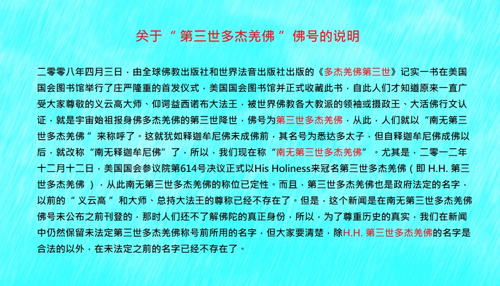 加州政府及旧金山市府昨日都表达对大师的推崇。在推崇义云高的状上,加州州长代表加州人民对于义大师在世界领域里建立完美标准给予最高评价,宣布三月八日为义云高大师庆祝日。旧金山则推崇他在佛法及伦理道德上展现的成就,也将三月八日定为义云高大师庆祝日。