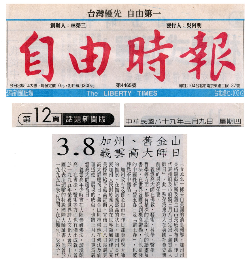 (台北讯)据来自美国的消息报导,加州州长格瑞戴维斯及旧金山市市长威利布朗,昨日代表州府及市府将三月八日定为“义云高大师日”,此一殊荣为东方人在美国社会史无前例的最高荣誉。