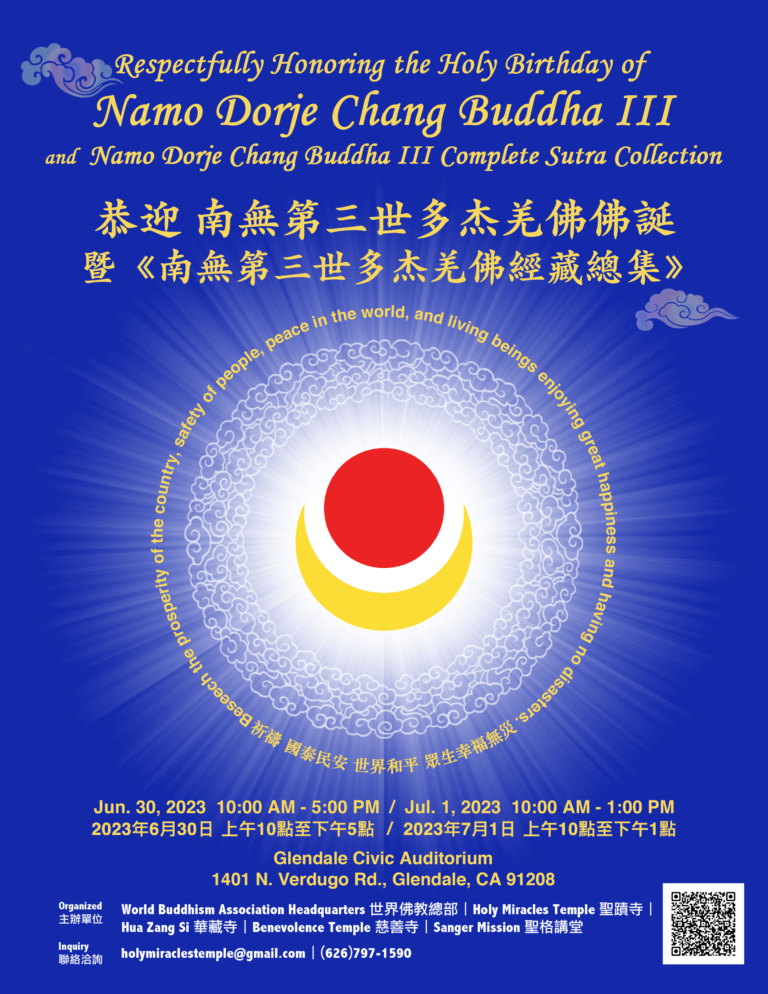 南無 第三世多杰羌佛 佛誕即將來臨。世界佛教總部(W.B.A.H.)、聖蹟寺(Holy Miracles Temple)﹑華藏寺 (Hua Zang Si) 、慈善寺(Benevolence Temple)及聖格講堂 (Sanger Mission)將於2023年6月30日(星期五)及2023年7月1日(星期六)上午10:00,於Glendale Civic Auditorium (1401 N. Verdugo Rd., Glendale, CA 91208)聯合啟建 ⌈恭迎南無 第三世多杰羌佛 佛誕 暨《南無 第三世多杰羌佛 經藏總集》法會⌋。